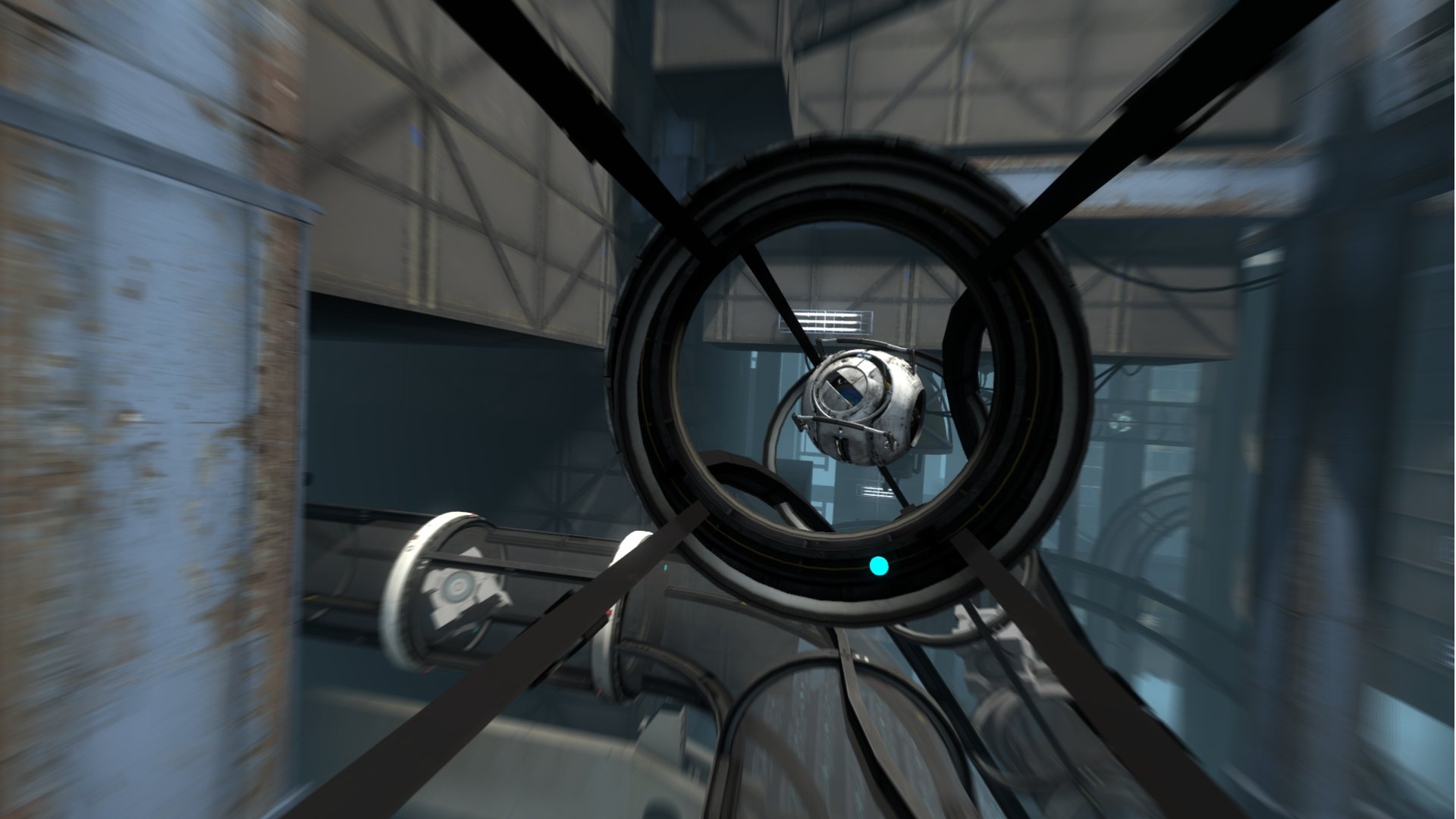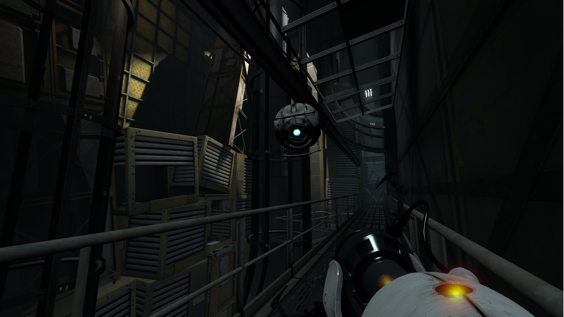 30 - Wheatley wants to join me on the ground and tentatively drops down. I’m carrying him with the portal gun like it was the gravity gun in Half-Life 2. He opens up a secret panel and we’re behind the scenes now.