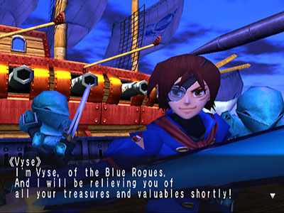 26 - In the following conversation, Vyse explains that there are two types of pirates, the Blue Rogues (the good guys of course) and the Black Pirates (the mean and dastardly pirates). Vyse basically says that the Blue Rogues rob from the rich and give to the poor. How original. Vyse and Aika are called out of the room by Dyne and I'm back in control.