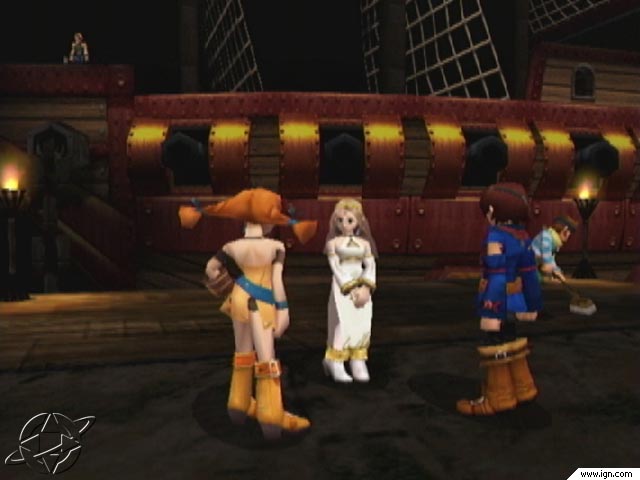 ) in terms of graphics. It's not really about how many polygons you have, it's how you use them. Skies of Arcadia does not use them very well, unfortunately. The environments are bland bland bland, the characters look okay, and the animations are mediocre at best. This is a very average looking Gamecube game. On the other hand, I enjoyed the music quite a bit, but the sound effects were cheesy and the lack of voice acting is seemingly inexcusable, but you have to remember that Skies of Arcadia originally came out in 2000, before voice acting in epic RPGs became the norm.