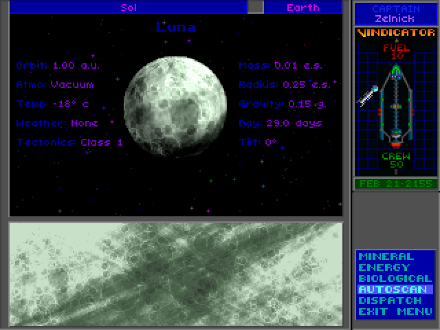 07 - I decide to head towards our Moon. It appears on my main screen, just rotating. I find out I can scan it for some information. Actually I'm able to do a bunch of different scans: Mineral, Energy, and Biological.