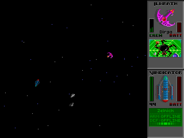 Gameplay in Ur-Quan Masters can be a mixed bag. Menu navigation is easy enough and the simple graphics lend to that. The spaceship controls just like a real spaceship probably would - objects in motion stay in motion. This can be difficult to handle as I overshot planets a lot, undoubtedly wasting precious fuel in the process. So thus cruising around on the planets in my land rover is disorienting because it controls with zero momentum. And finally we come to the ship-to-ship battles, which feature an insane combination of always facing the wrong direction and slow turning. I never felt like I had enough fingers to do everything I needed to do, which is probably why I forgot to shoot those first couple of attempts.