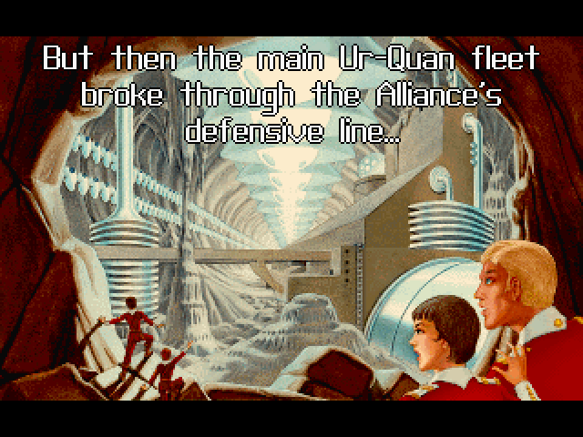 00 - I select New Game and the hour long timer starts. Some information on the open source release flashes by, and then the game begins. It's the story of what happened years before the game (not sure if this is Star Control 1's story or if they're in separate universes), there was a war between the Alliance of Free Stars (obviously the good guys) and the "evil Ur-Quan" (obviously the bad guys).