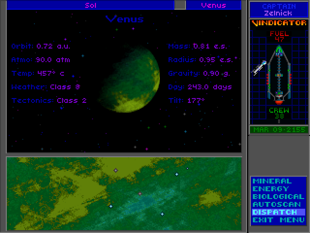 56 - My next stop is Venus, a very green planet in this game. A quick scan shows very few minerals and nothing else. Well, that sucked. I was on the planet for approximately three seconds before my lander blew up! Lightning struck it from all over and before I could even give the message to get out of there, I was a goner. 12 crew members and a 500 RU lander gone without warning. Hardcore.