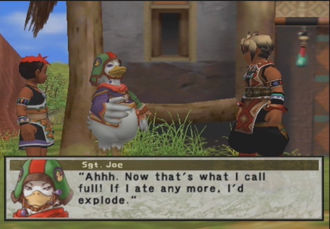 08 - Okay, got past the loading screen. Hopefully won't run into that problem again. A scene begins with Hugo, riding on the back of some unicorn-like beast, racing towards a small village. Oh, and there's a griffon and duck soldier with him, too. The duck soldier's name is Sergeant Joe, and the griffon is Fubar. The grassland village belongs to the Karaya Clan, and this eccentric trio is hungry and looking for food.