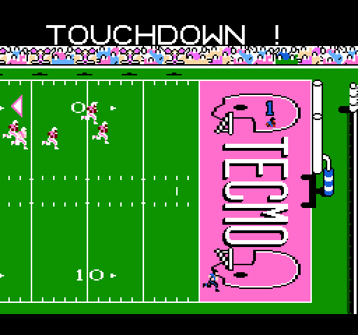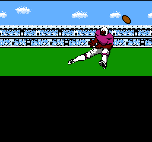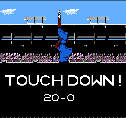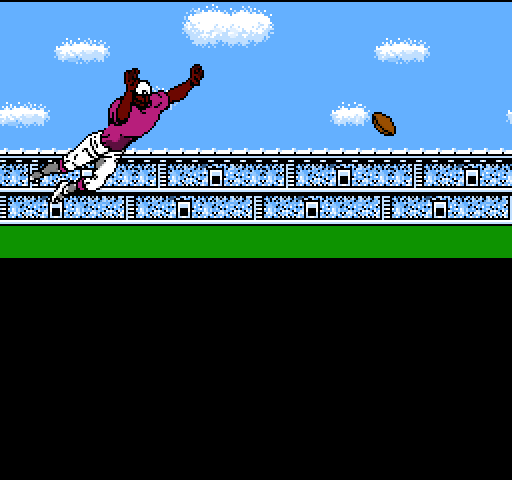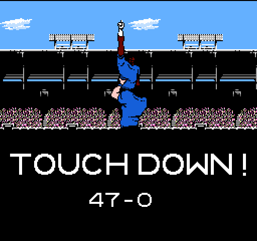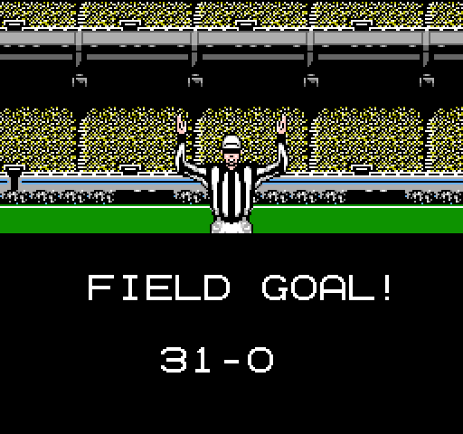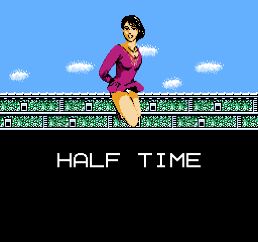 The thing that surprises me the most about Tecmo Super Bowl is the number of sprites on the field. We have 11 players on each team, so that's 22 sprites, and then we've got the football, the goalposts, cheerleaders, and first down markers. That's a lot of characters drawn on the screen, the problem is, only eight sprites can be updated at a time on the NES, so you get quite a bit of flicker when there's a lot of action going on. This is disappointing as it can be quite distracting when trying to navigate your running back through a defensive line. The game does feature some cool cutscenes though when an important play is happening, and there are at least two different half-time shows that are animated nicely. The sound in Tecmo Super Bowl is classic: the "hut hut hut hut hut hut hut" before each play is something I will never forget. The sound effects are not necessarily realistic, but they fit the arcade style of play.