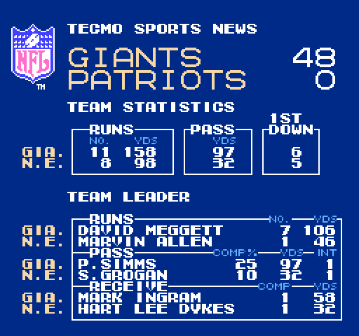 60 - It's pretty obvious the New York Giants are one of the dominant teams in Tecmo Super Bowl, as the teams' stats are based off their 1990 season... the year the Giants last won the Super Bowl (the game actually ended on a missed field goal by the Bills' Scott Norwood - Wide Right). And if you're wondering, the New England Patriots went 1-15, by far the worst team in the league and almost virtually opposite of their perfect 16-0 season this year. By the way the Giants whooped the Patriots in both simulated games, I think Tecmo did a pretty good job on those stats. Well, that's it for the first hour of Tecmo Super Bowl and my pre-enactment of Super Bowl XLII!