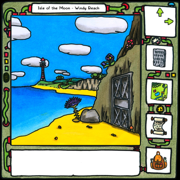 38 – Wait. I got outside. I tried running the “unlock” program on the front door, and it opened. All righty then. Smell you later, Underhome. New, pretty piano music plays as I take in the colorful beach setting. My text window tells me that I’m on the Isle of the Moon.