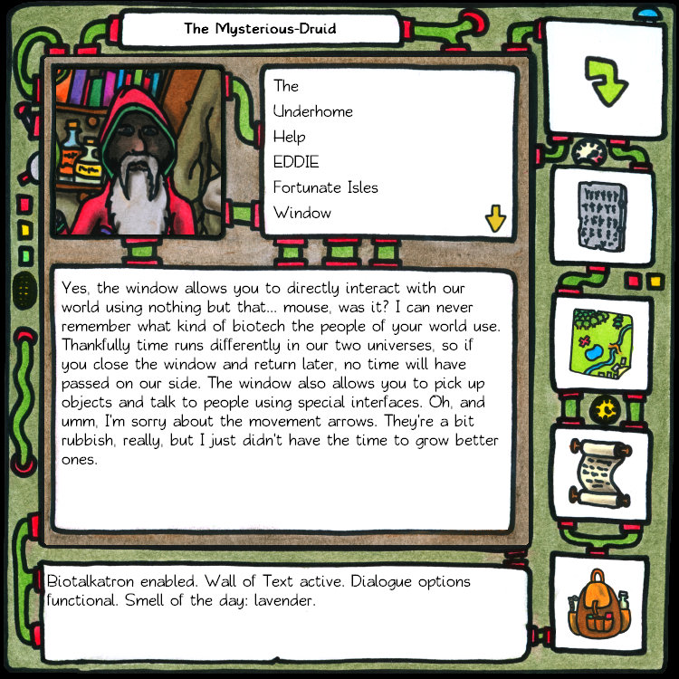 03 – Ah, so that’s who was talking to me; he looks like a wizard. In full control now and can click around the screen. It’s an office setting. In fact, you can click on nearly everything on the screen. Just about every item, from the bottles on shelves to the teeniest mushrooms, is ripe for examining. A portrait tells me the name of the wizard before I even speak to him: Rupert Mysterious-Druid. Though he prefers to be simply called The. I also earned my first quest, to fix Underhome’s air filtration system. Scroll updated.