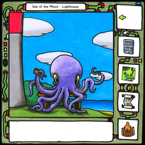41 – The lighthouse is locked. Around the corner though is an octopus. Wait, no. His name is Jack the Octopirate. Other than him, this place is a dead end. Retracing my footsteps then.