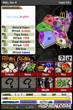 46 - I finally regain control! The soda can pin is for HP regeneration. I go into the phone menu to check things out. A seven page tutorial opens up about the top screen's layout. You can adjust the level of difficulty and your character's levels. Interesting. Well, you can only adjust to a level you've reached, so I'm stuck at level 1. I am able to save my game though.