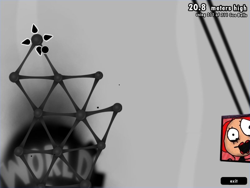 58 - Haha! Okay, I'm back. I was just working on building my goo tower, which is actually pretty fun, but I think it would get really frustrating the higher you get. It seems that the only efficient way to build a stable tower is to build a wide, solid base and build up evenly from there. Lots and lots of triangles.
