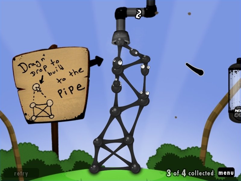 and has been a huge hit across the board. The goal of the game is to get the required number of goo balls into each level's pipe. You use the goos to build bridges, towers, and anything else you can imagine and construct. The game's impressive physics are really its highlight, but it doesn't slack in any other areas either.