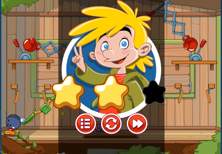 But eventually, you'll load a new level with a sparse play area no no idea where to start. The objective looks impossible, the stars are far out of the way, and the available tools seem pointless. Alex's true worth is in these blank canvases, where experimentation is a necessity. The path to success is traveled one step at a time: take an object, play around with it, and see what happens. There's no penalty for making adjustments, and the perfect consistency of the physics system ensures that random chance won't be a factor as you tweak each step in the plan. I was surprised how many stages I finished after starting with an exploratory first step with no endgame in mind.