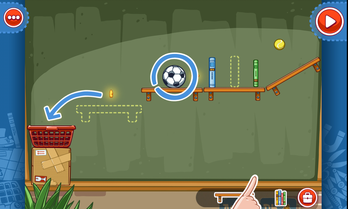 The tutorial stages start out easy enough, with dotted guides showing exactly where to drag the handful of shelves and dominoes and such in order to achieve the goal. Place your items, hit play, and enjoy the show.