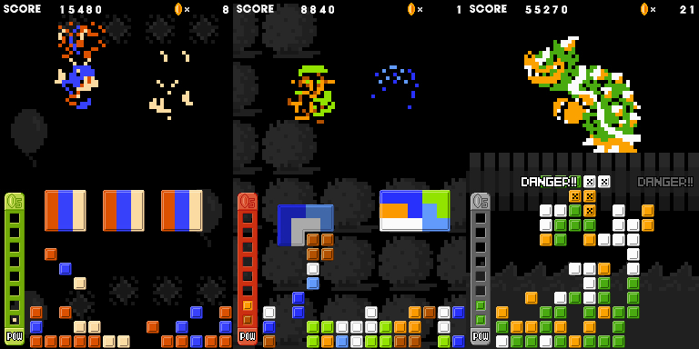 A few emergency options exist as well. If the junk builds too high, clicking the POW button in the left corner will clear the bottom rows and pull all the pieces to the bottom of the play field, even the immovable ones. But abusing the POW button will restrict the number of pieces that can be held at once, which is necessary to manage the play field. The limitations can be lifted by spending coins, which are earned primarily through chaining. These coins, if saved, can also be spent on tougher "Dark" stages and a sound test mode, too. I was a bit annoyed, grinding through old stages to unlock new ones, but the coin requirements are mostly fair.
