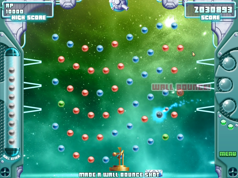 Green orbs serve as powerups, allowing players who breaks them to augment a future chosen shot with one of three special effects. The first is a fireball, which will power the shot ball through through any hit balls, avoiding the standard bounceback. A downfall to this powerup is that generally, only a few orbs can be destroyed per shot using this method, and gravity paddle returns are deactivated with the fireball. The second powerup is gravity control (my personal favorite), which allows you to directly control the paddle at the bottom of the screen. Normally the paddle only moves slowly back and forth on its own. If a shot ball hits the paddle, gravity temporarily reverses and the ball flies up to the top of the screen before dropping again. This essentially gives you three shots for the price of one (not as controllable of course, but close) and many more opportunities at extra balls and score bonuses. Without the powerup, paddle hits only happen very rarely, perhaps once every two full screens. The third powerup is an explosive ball, which will cause the shot ball to explode on contact with a red ball if it is the first touched. The explosion will vaporize all nearby balls as well as causing a decent bounceback. In terms of strategy, I've found that gravity control is best used as early as possible or in a situation to force an extra ball where you may not otherwise get one. Explosions can come in handy during various scenarios to destroy stubborn hidden orbs or just to clear an area. Fireball is mainly used to clear a couple orbs shielded by others nearing the end of a level.