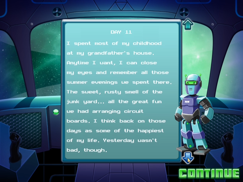 Caelum also includes little light-hearted story/dialogue sequences, where the ship's robot interacts with the player between each stage. It begins by talking about the purpose behind the game and continues through by telling jokes and talking about humorous interactions with planets and fellow travelers. The official story is as follows: "Humanity faces a severe energy crisis. Having used up the planet’s resources, we must look to outer space for alternatives – and, fortunately for us, space is filled with energy orbs just waiting to be collected. This is where ROB comes in – short for Robotic Orb Blaster, his task is to blast those orbs! On his journey he’ll encounter new friends and exciting adventures, and explore the depths of endless space." So, it's nothing substantial of course, but certainly a nice attempt by the developers at breaking up the monotony of puzzles and explaining some purpose behind the game and the player's actions.