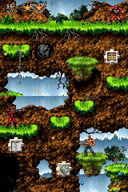 It’s not all bad, but even Contra 4’s strengths come with downsides. Wayforward Technologies is one of the last dedicated 2D art studios in gaming, but their lush take on Contra backgrounds and character sprites often obscure bullets and missiles and other dangers. The tall, dual-screen layout of the action makes for some creative vertical scenarios, yet scanning both at once is nearly impossible. And the level design exhibits impressive variety, almost never using an enemy type in more than one stage. That also means each learning experience is one-and-done, never combining or layering obstacles in a traditional difficulty curve, instead shifting gears completely in every stage.