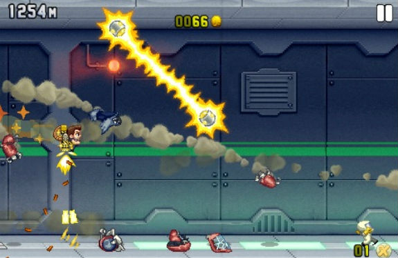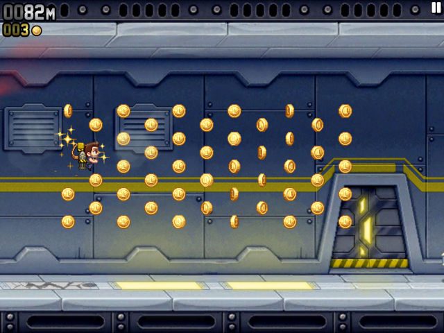 Jetpack Joyride stars Barry Steakfries, a manly man who bursts through the wall of some kind of science facility, steals a jetpack, and wrecks havoc for the next 200 to infinity meters as he auto-runs from left to right, slowly speeding up. Barry can jet up, or fall down, that’s it. Left and right isn’t even an option. Temporary vehicles show up every once in a while to inject a little extra craziness into the game, but take one hit and you’re back to just Barry, another hit ends your run.