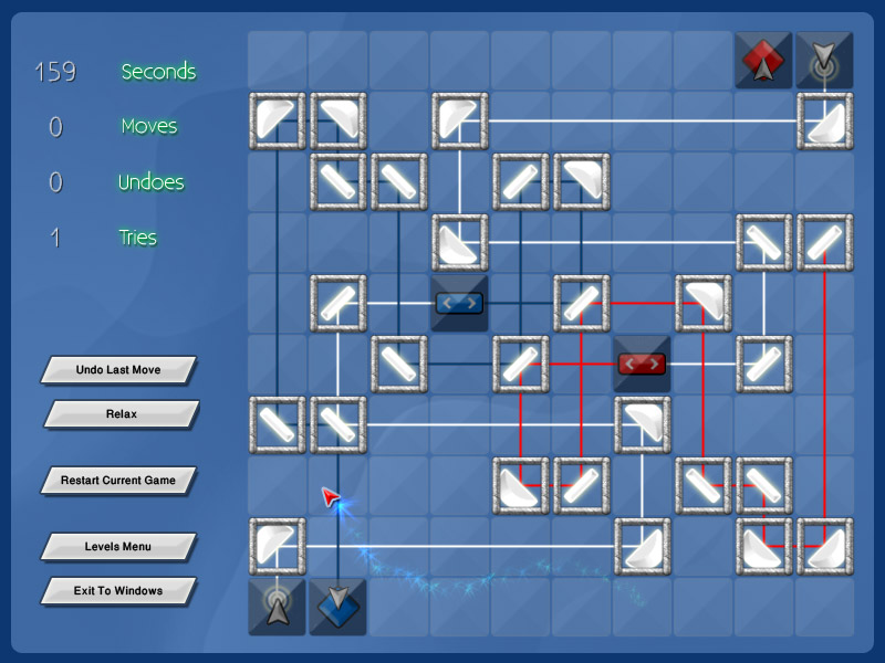 L!ght deluxe is built on a basic concept that allows degrees of complexity to be added as you advance through the "levels". At its elemental level, you are trying to connect a line, uninterrupted, from its origin to its ultimate destination. Each puzzle takes place on a large grid, much like a Chess board. Early levels are smaller, perhaps grids that are 6 x 6 squares in size. However, as levels increase in complexity and difficulty, they get larger.
