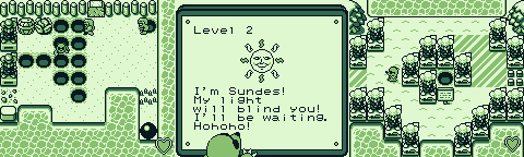 A multiplayer mode is also included on the ROM, but 3DS owners can’t access it: Nintendo either hasn’t figured out how to emulate the Game Boy’s link cable connections or doesn’t care to do so. It’s a shame, as the one-on-one competition sounds interesting: one player is tasked with pulling cabbages underground as Muddy Mole while the opponent plays as Jinbe, plugging holes and attacking Muddy with a hoe. It’s a shame Mole Mania flopped, as the dual-plane surface/underground layout and POV-focused multiplayer would be perfect in a followup for the DS/3DS or even Wii U.