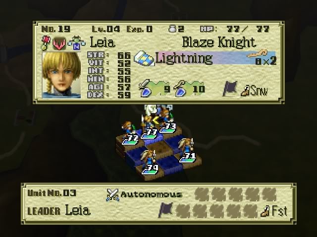 The one thing that Ogre battle is famous for is its class system. You first start with soldiers, which is a group of three little guys with spears. When they level up, they turn into a single fighter or amazon (dependent on what gender the leader of the unit is). Then, depending on how they level and what their alignment is (their alignment changes with whom you kill and what choices you make) you will be able to change them into different classes that do different things. You then get to change their class again, and you can usually laterally class change, which is useful.
