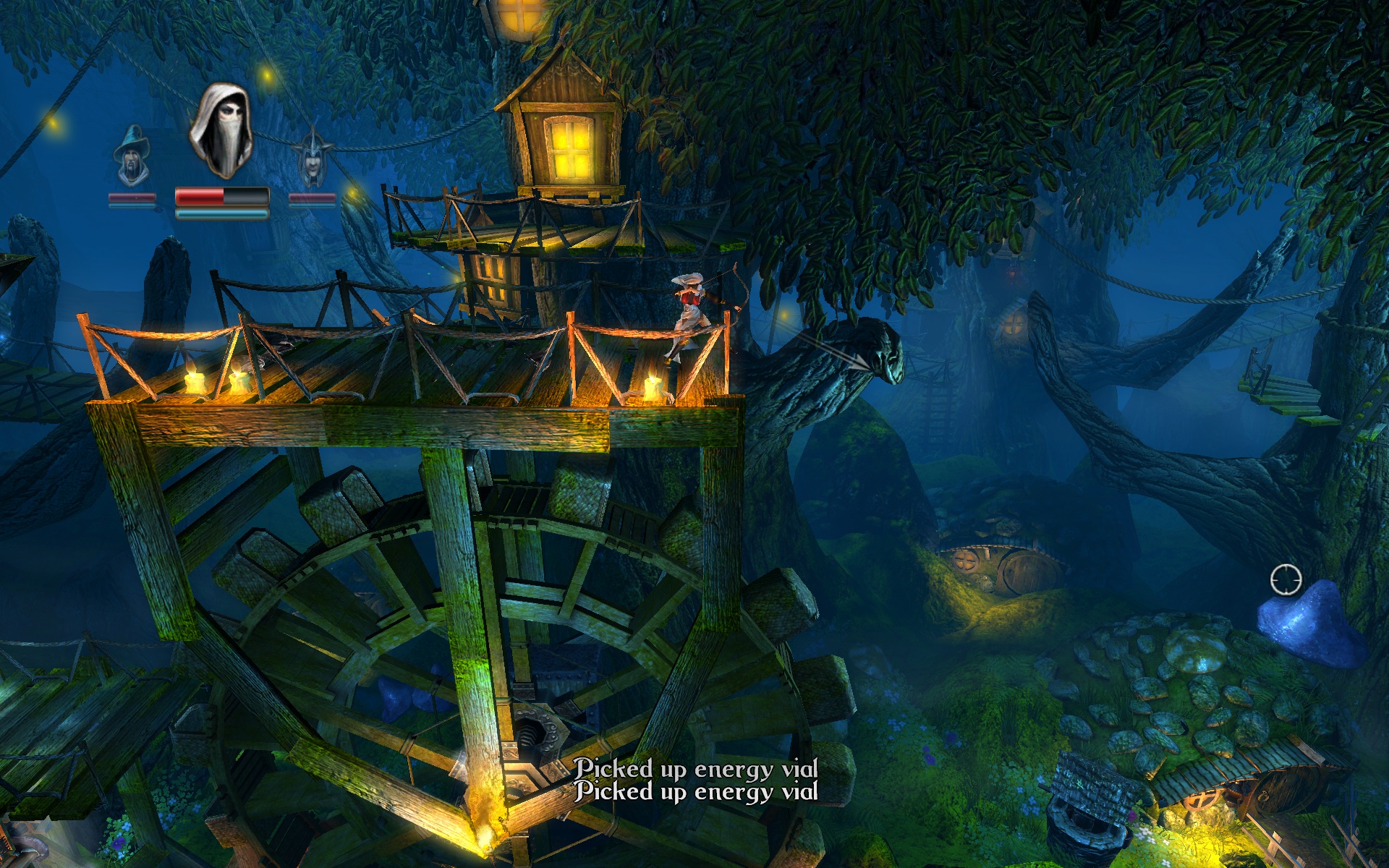 Once past the introductory level, gameplay holds as follows: The player controls the thief, wizard and knight, which are linked to the same avatar by the trine. Switching between characters is instantaneous and simple on mouse and keyboard, activated by merely pressing the corresponding button (eg: 1, 2, 3). The avatar's movement is controlled by the keyboard and aim controlled by mouse. Left click activates the primary attack (shoot, 'magic,' slice) where right click activates secondary (grappling hook, levitate, shield). The mouse wheel scrolls through available weapons and optional weapon enhancements. Unfortunately, I did not significantly test a gamepad, but mouse and keyboard controls are very suitable and should come naturally to PC gamers.