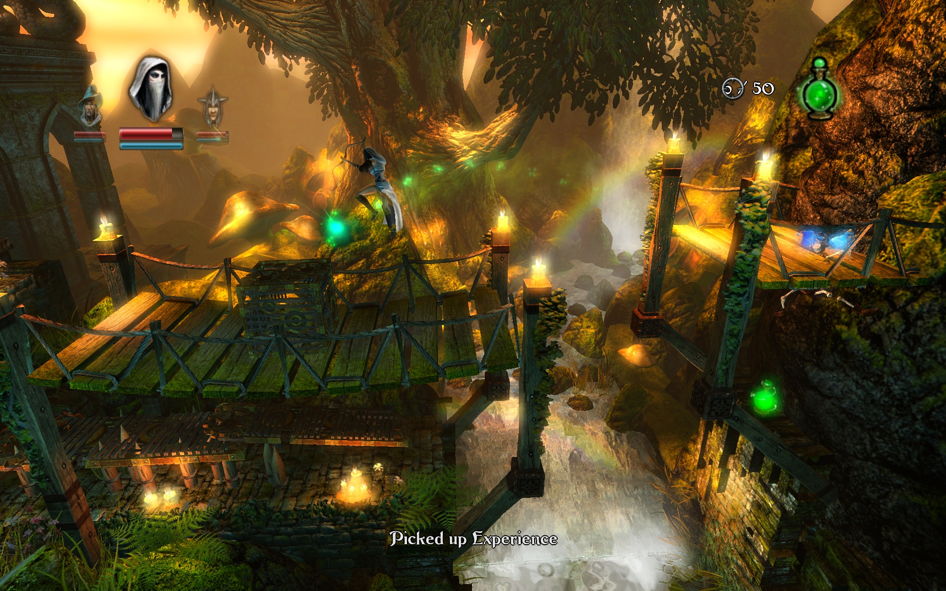 At times, players come across these items which further enhance their characters. Many can be swapped among the three, for customization and specialization purposes. Some examples of these items: Fish vial, allows the character to breath underwater; Amulet of Sacrifice, when low on energy, health will be used instead; Prism of Light, at each checkpoint, the character receives 25% more health and energy. Items are generally unique and the majority of them offer bonuses to multiple characters, making the appropriations significant while still adding variety and micro-management depth.