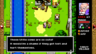 One element that doesn’t quite develop is the tiny RPG town full of townspeople with typical one-line personalities and no purpose except to act as a protracted shop between each world. You can donate your accumulated wealth to each citizen to help rebuild their homes (and receive useful items in return), but there are no quests or sideplots to be uncovered. The town is merely a rest-stop between each dozen of stages.