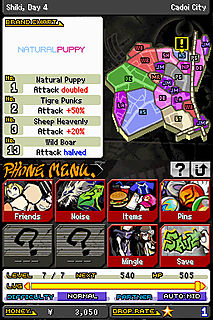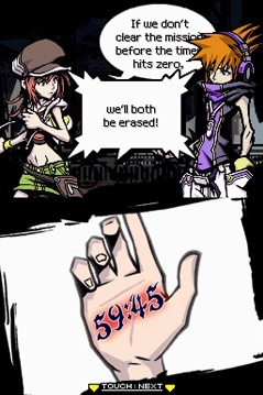 More forgettable, however, is just how unique TWEWY is among RPGs. The setting is modern Tokyo's Shibuya shopping district, on an alternate plane of existence reserved for the recently-deceased. Here, the departed play a cruel game hosted by divine entities, where winners are resurrected and losers have their existence erased completely. The player fights for spiritual survival using two characters on two screens with two different control schemes and two completely separate battle systems...simultaneously. The dead characters' valor in battle depends on how their current wardrobe meshes with the fashion trends of the living in each district. The game's style and soundtrack are, appropriately, very Japanese in nature, with a Shibuya youth-culture appearance and plenty of Japanese pop/rock/hip-hop tunes. Even the characters are remarkably unrelatable to genre regulars: the player character is the poster-child for the headphones-obsessed emo scene, one ally is an outspoken fashionista, and a certain opponent speaks almost entirely in calculations and mathematical terms. The game even rewards the player with experience points for not playing the game. To say there's a lot of crazy new ideas going on here is an understatement.
