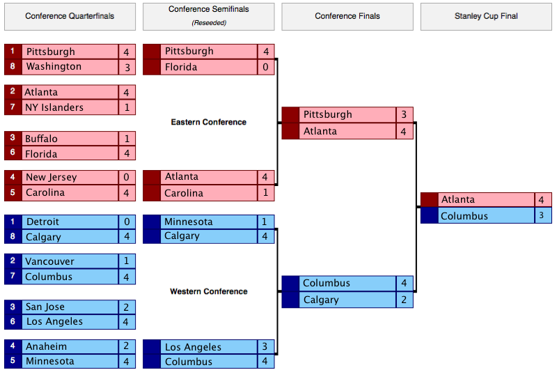 - Round 3 shall see Pittsburgh in the Eastern Conference Finals for the third time in four years, though they'll go belly up against an Atlanta Thrashers team that enters the round with an impressive 8-2 record. Meanwhile, Calgary's blazing 8-1 performance in the first two rounds will be snuffed out on their home ice by the Columbus team just coming off a tough series.